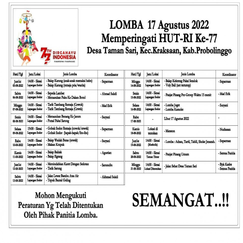 TAMANSARI_Hari Ke_4 Lomba 17 Agustus Dalam Rangka Menyambut dan menyemarakkan Peringatan Hari Ulang Tahun (HUT) ke-78 Kemerdekaan Republik Indonesia (RI) yang jatuh pada tanggal 17 Agustus,Senin (15/08/2023) Desa Tamansari menggelar berbagai macam perlombaan dalam memeriahkan HUT RI yang ke-78. Kegiatan 17 Agustusan ini sudah disiapkan sebelumnya oleh panitia dan peserta lomba. Dimana di hari ke empat ini yaitu Lomba Menangkap Bebek dan Loma Balap Karung Yang diikuti oleh semua kategori Anak - anak dan dewasa.